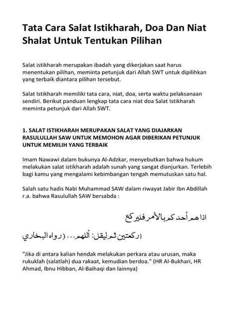 Dalam kehidupan, kita sering dihadapkan pada pilihan-pilihan sulit yang membingungkan. Keputusan penting seperti memilih pasangan hidup, pekerjaan, pendidikan, atau investasi seringkali menimbulkan keraguan dan kekhawatiran. Dalam Islam, kita diajarkan untuk tidak hanya mengandalkan akal dan pertimbangan manusia semata, tetapi juga memohon petunjuk dari Allah SWT melalui shalat Istikharah. Shalat ini adalah sarana untuk meminta bimbingan-Nya agar kita diberikan kemudahan dalam memilih yang terbaik sesuai dengan ridha-Nya. Artikel ini akan membahas secara mendalam tata cara shalat Istikharah yang benar, adab-adab yang perlu diperhatikan, serta doa-doa yang dianjurkan.