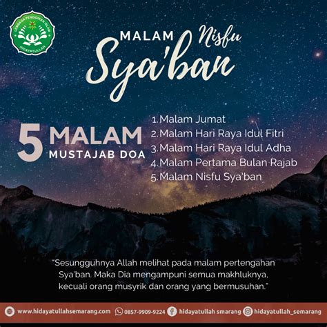 Malam Nisfu Sya’ban, yang jatuh pada pertengahan bulan Sya’ban dalam kalender Hijriyah, merupakan salah satu malam yang dimuliakan dalam Islam. Malam ini diyakini memiliki keutamaan khusus, di mana Allah SWT membuka pintu ampunan dan rahmat-Nya seluas-luasnya. Salah satu amalan yang sering dilakukan pada malam ini adalah Salat Nisfu Sya’ban. Artikel ini akan mengupas tuntas tentang keutamaan dan manfaat Salat Nisfu Sya’ban, berdasarkan dalil-dalil yang ada serta perspektif para ulama. Pendekatan yang digunakan adalah profesional dan serius, dengan tujuan memberikan pemahaman yang komprehensif dan proporsional kepada pembaca.