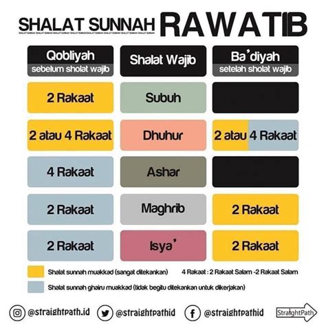 Salat merupakan rukun Islam yang kedua dan merupakan ibadah paling utama dalam Islam. Selain salat fardhu yang wajib dikerjakan lima kali sehari, terdapat pula salat sunnah yang dianjurkan untuk dikerjakan, salah satunya adalah salat rawatib. Salat rawatib adalah salat sunnah yang dikerjakan mengiringi salat fardhu, baik sebelum (qabliyah) maupun sesudah (ba'diyah). Ibadah ini, meskipun sunnah, memiliki keutamaan dan manfaat yang luar biasa bagi kehidupan seorang muslim, baik di dunia maupun di akhirat. Seringkali, kesibukan duniawi membuat kita melupakan atau meremehkan amalan ini, padahal ganjarannya sangat besar. Artikel ini akan mengupas tuntas keutamaan dan manfaat salat rawatib, dilengkapi dengan data tabel yang memberikan gambaran jelas tentang jenis dan jumlah rakaatnya.